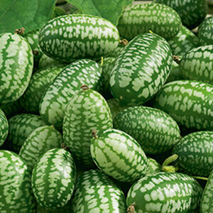 Mexican Sour Gherkin are fun-sized cucumbers that are shaped like miniature watermelons. They are pretty small, only about 1 to 2 inches long. These unique cucumbers have typical cucumber flavor but with a tangy, citrus twist. Vines have tiny leaves and flowers. Perfect for salads or pickling.